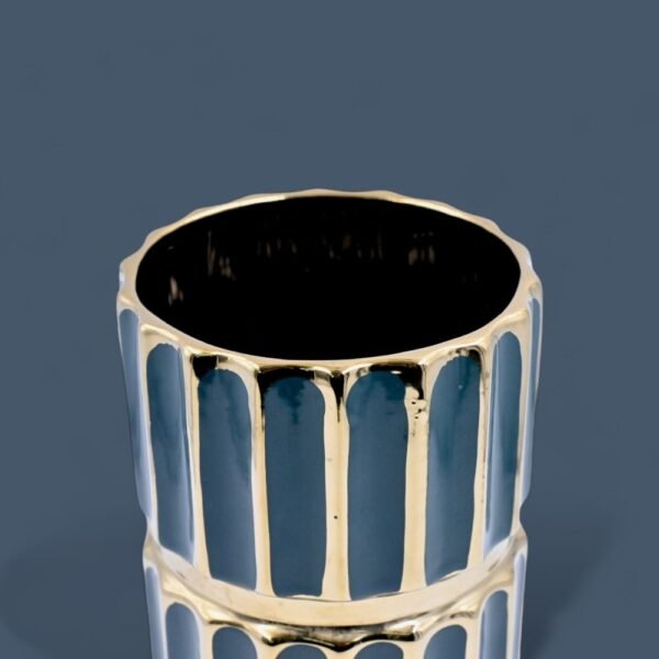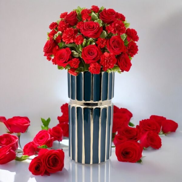 Discover the epitome of grace with this exquisite floral arrangement, a symphony of vibrant red roses meticulously selected for their lush petals and rich hue. Each bloom is a testament to nature?s artistry, cradled in an elegant vase that marries classic charm with modern sophistication. The striking contrast of bold florals against the sleek lines of the navy and white striped vase creates a visual feast, perfect for gracing any space with its timeless beauty. Whether as a centerpiece that commands attention or a thoughtful gift that speaks volumes, this arrangement promises to leave an indelible impression on any beholder.