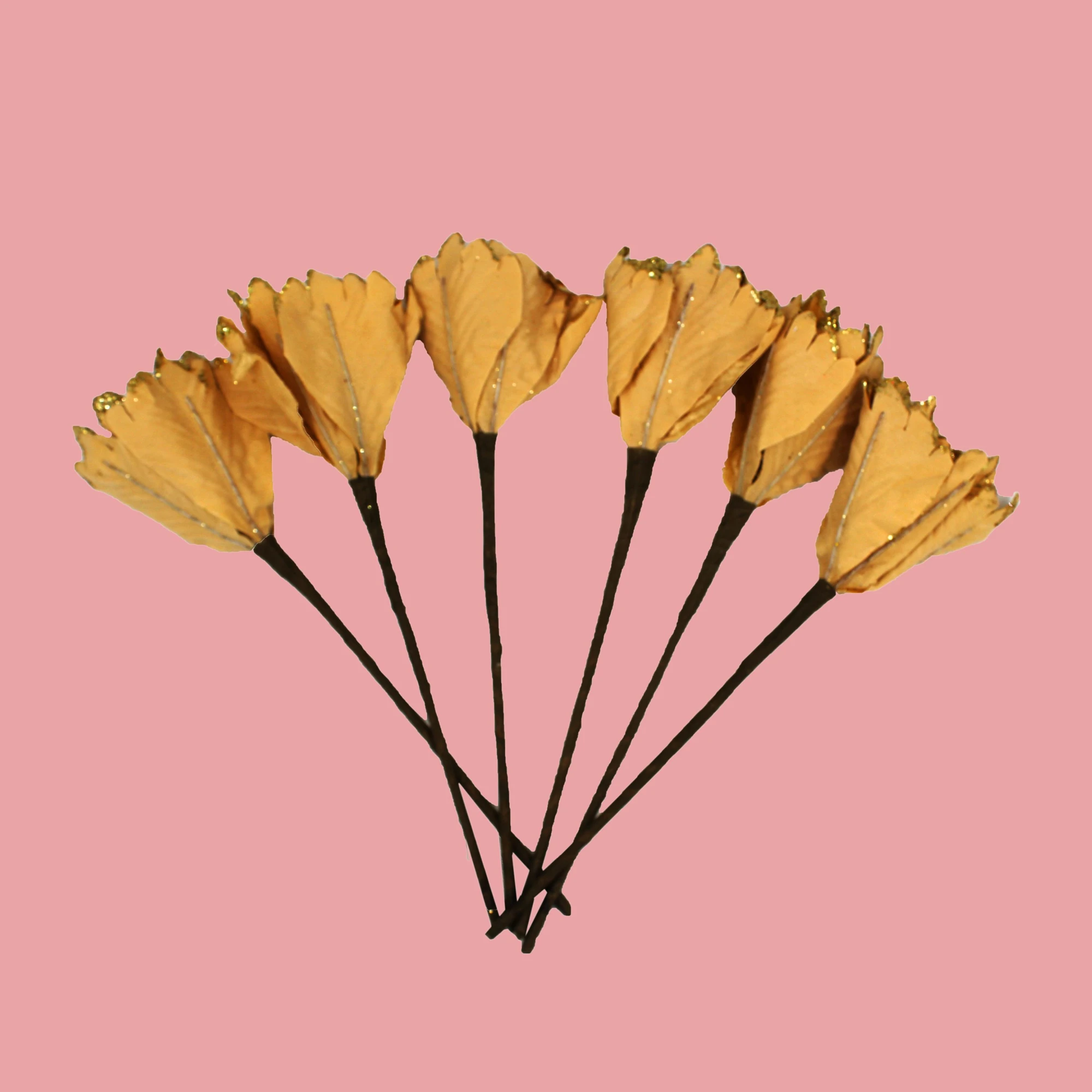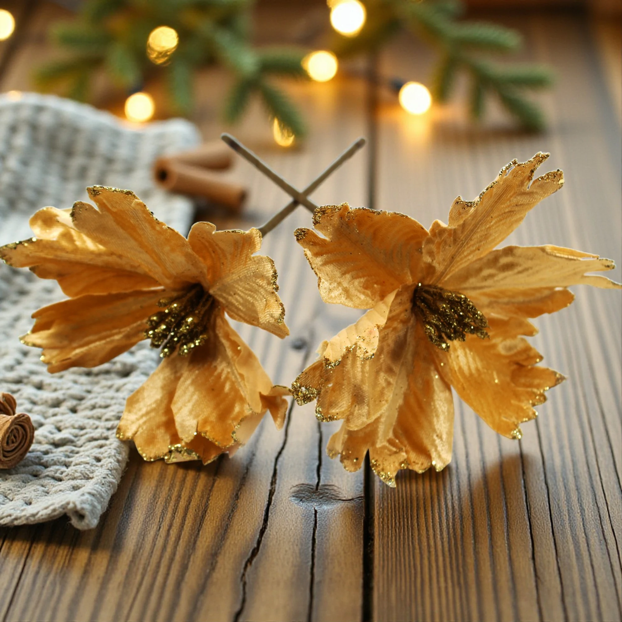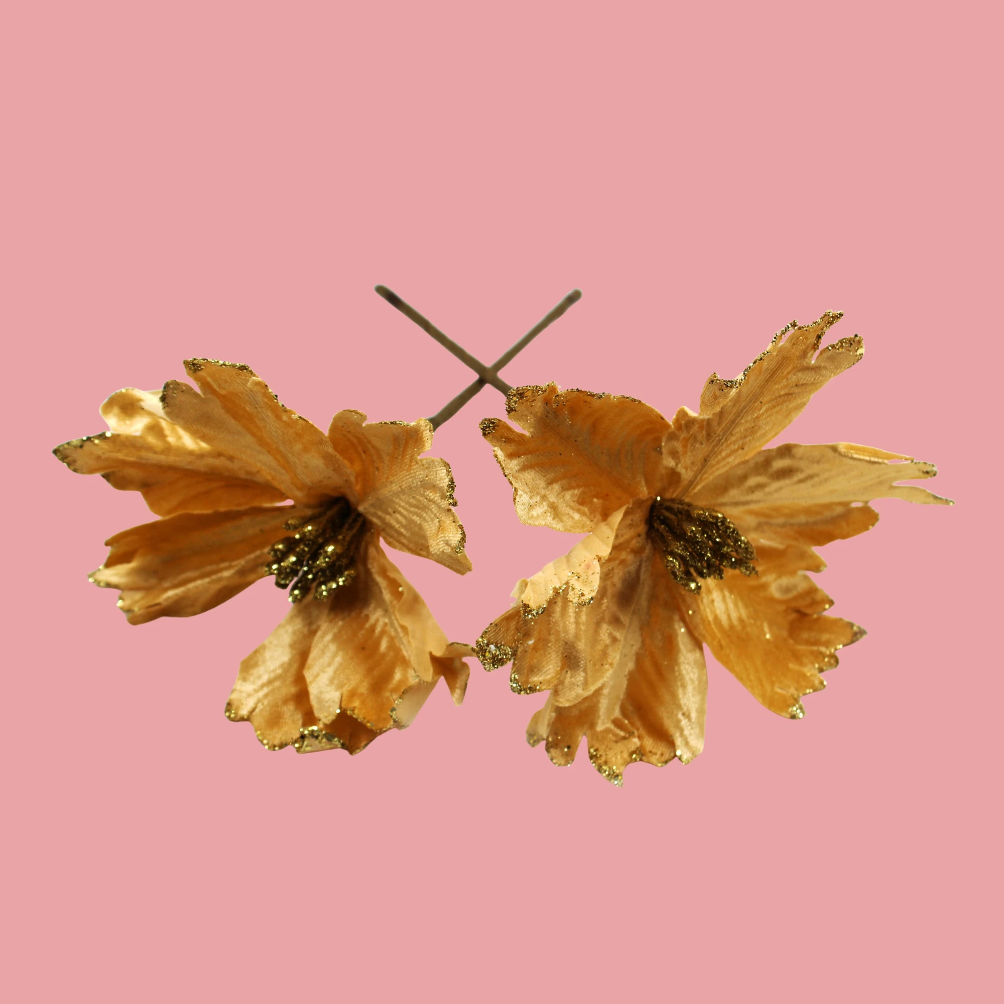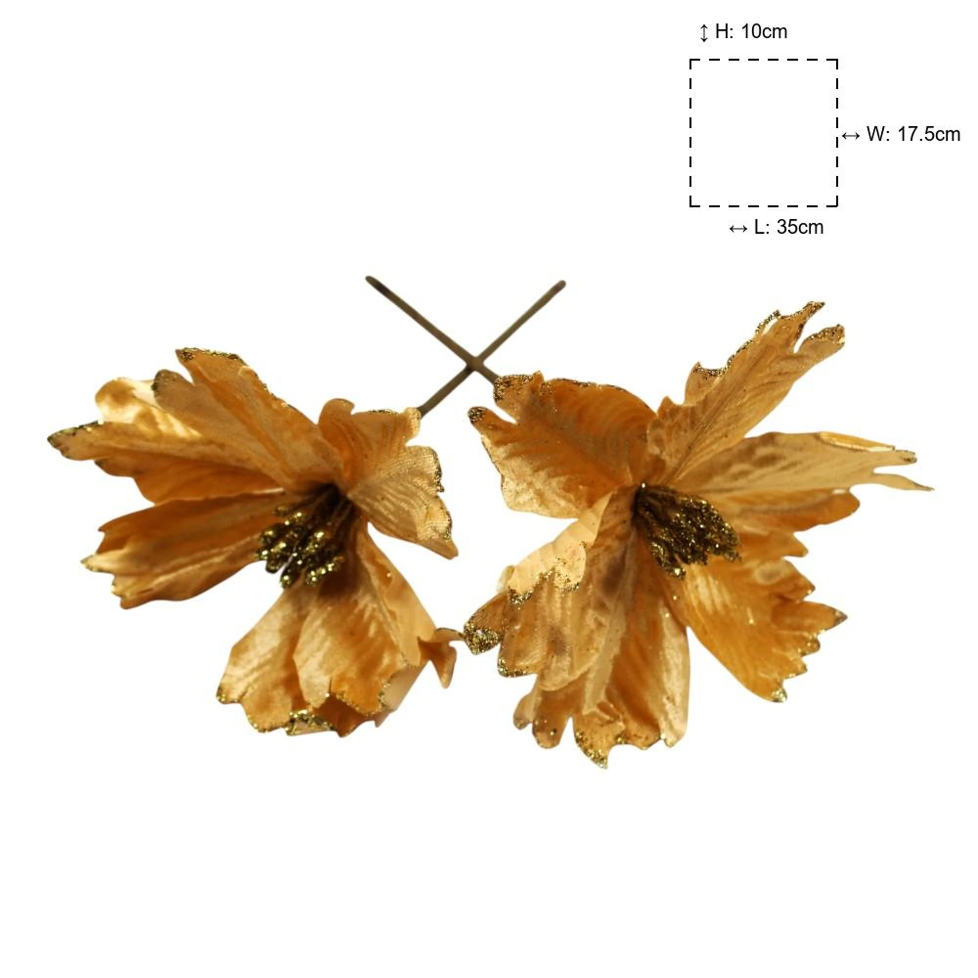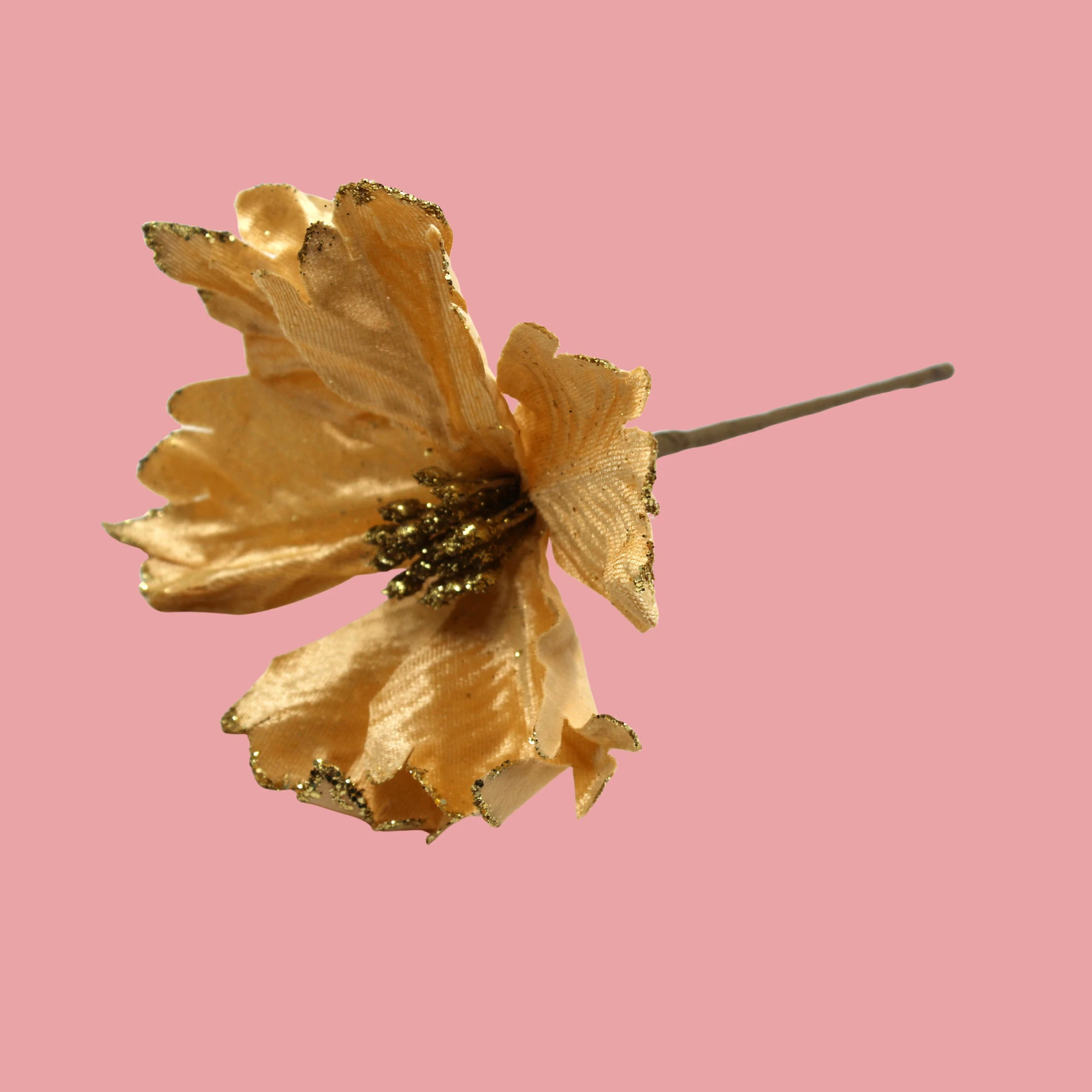 Add a touch of festive elegance to your home with the Velvet Pointsetia Flower Stick in a luxurious gold hue. Perfect for creating a warm, inviting atmosphere during the holiday season.