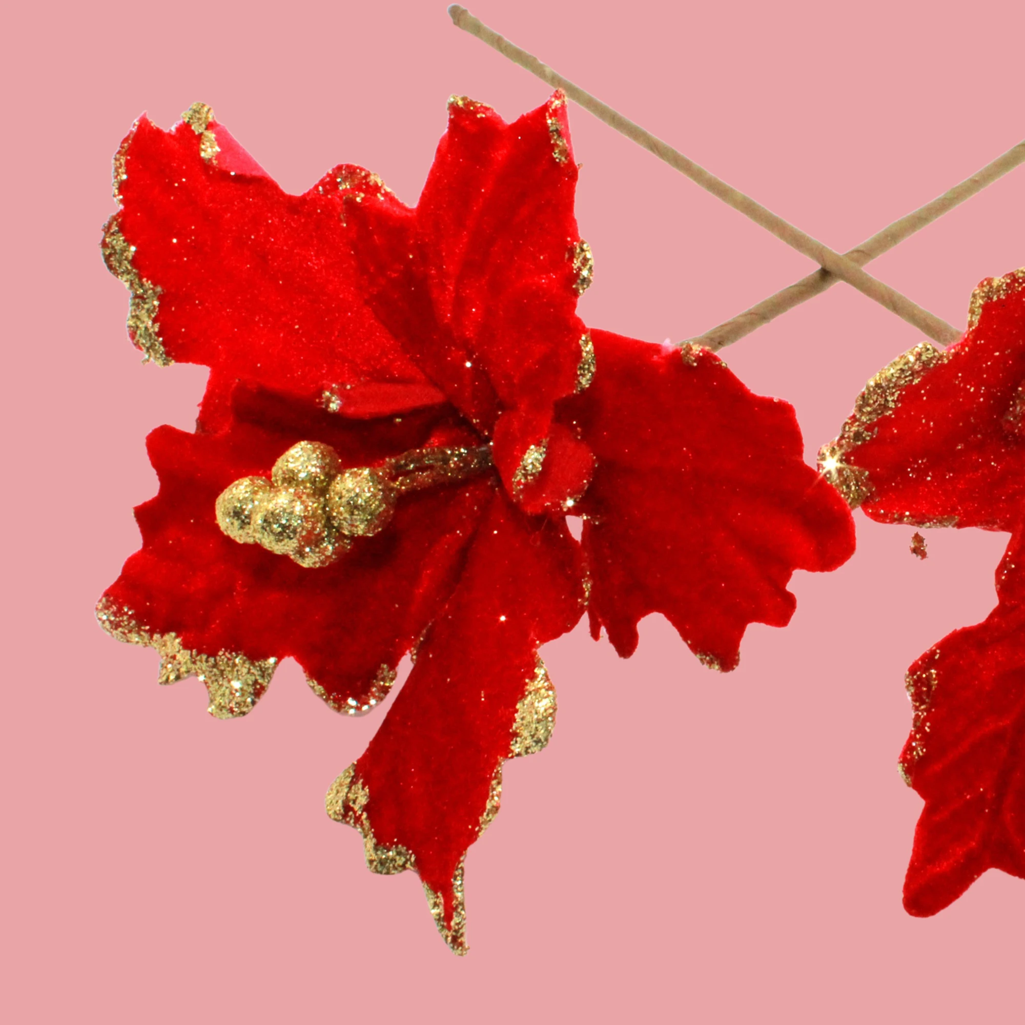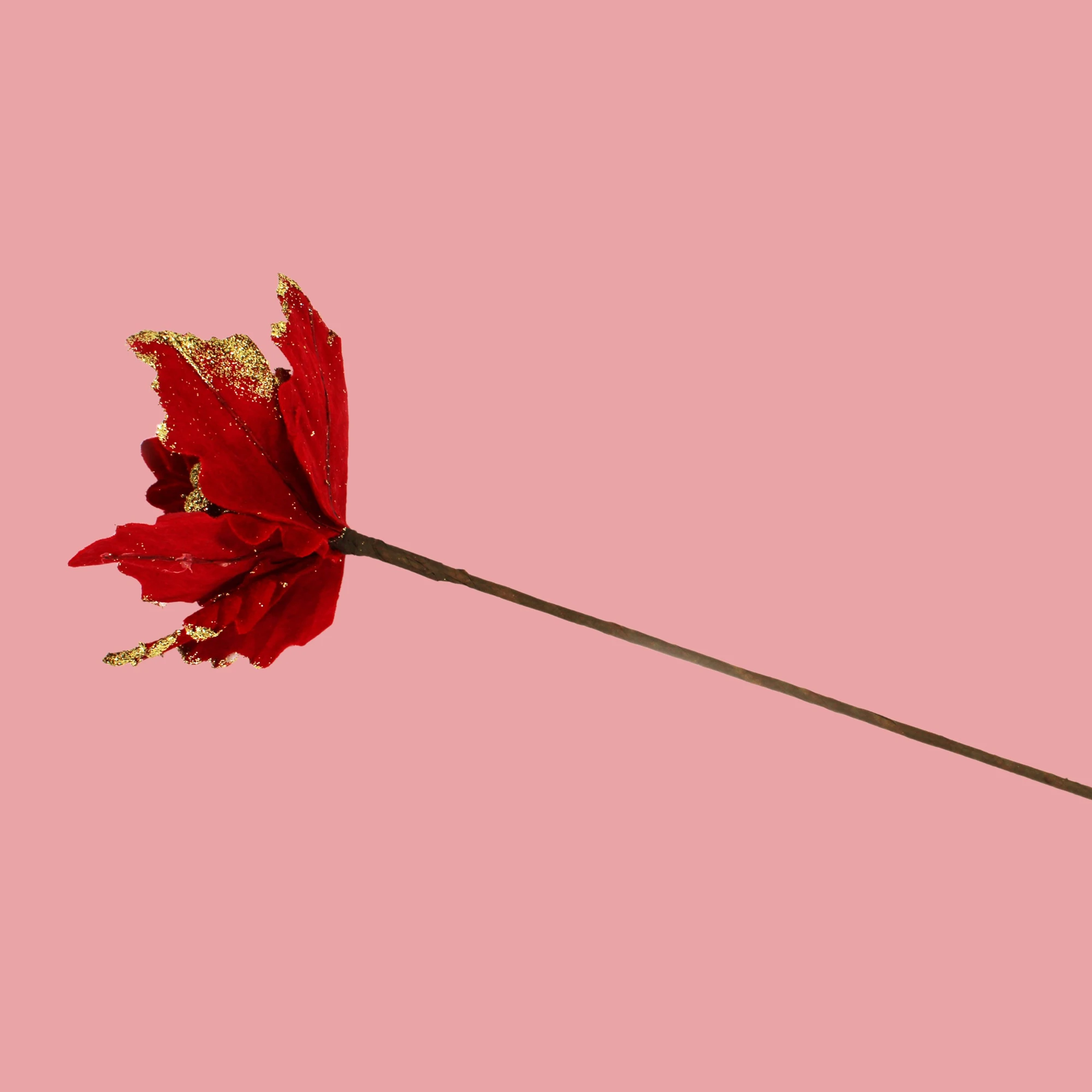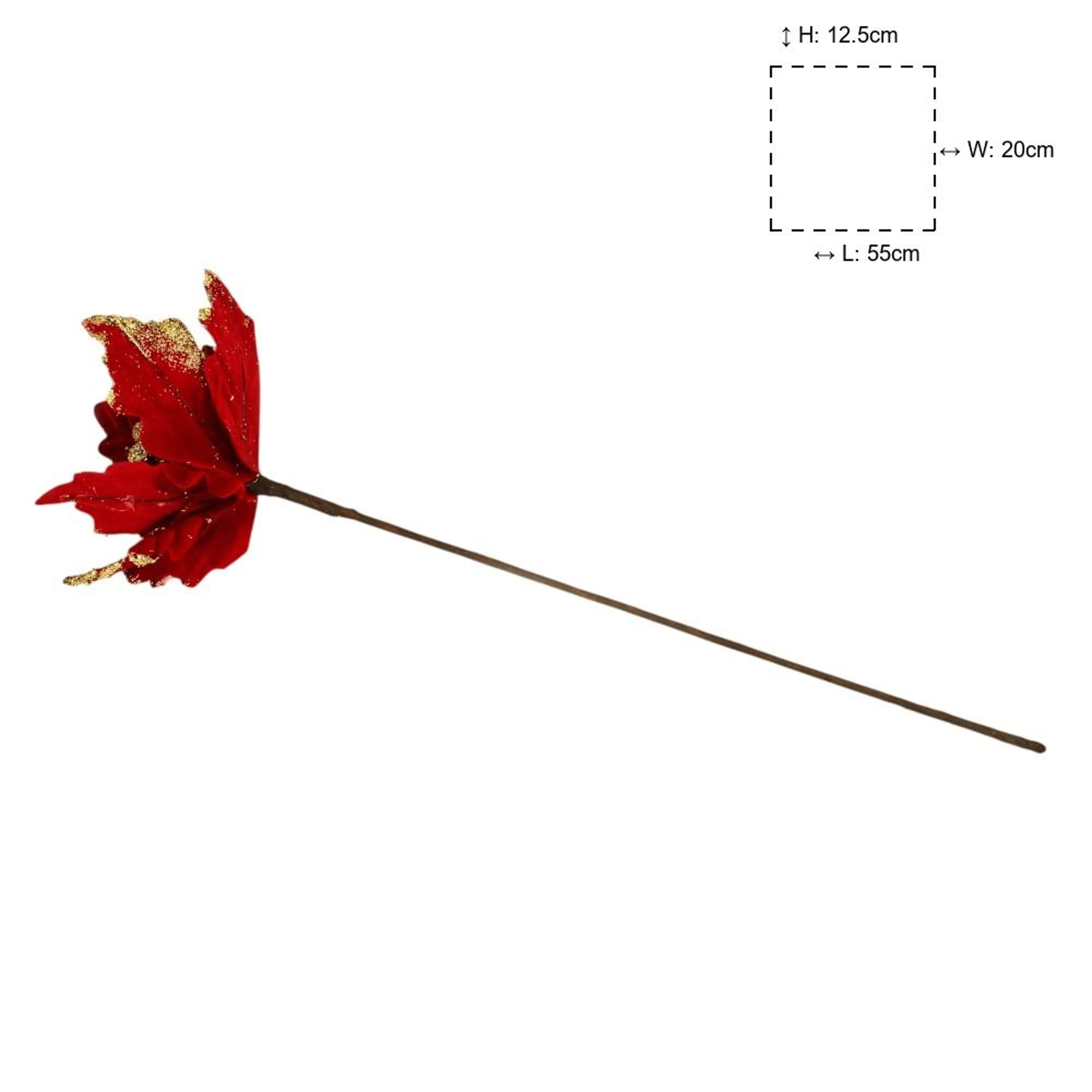 Add a touch of elegance and warmth to your holiday decor with the Velvet Pointsettia Flower Stick in Long Red. This beautiful flower stick features lush, velvety petals that replicate the classic beauty of the poinsettia, perfect for any seasonal decoration.