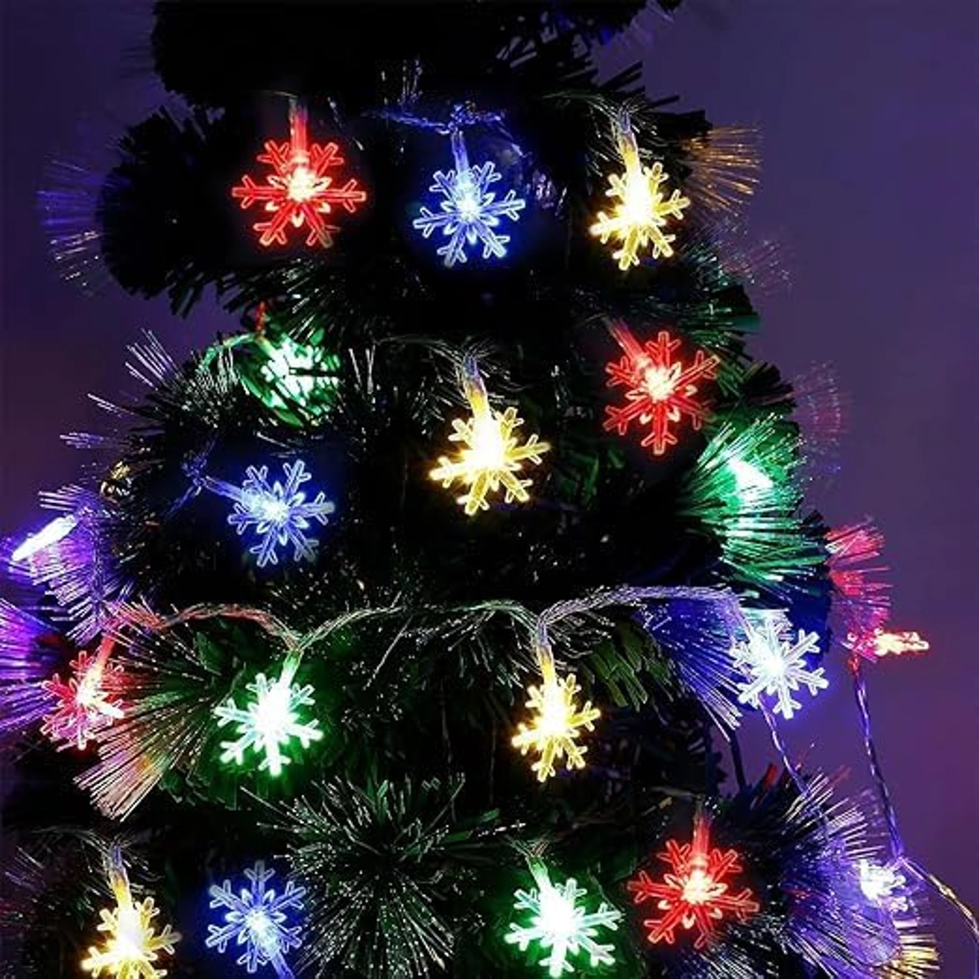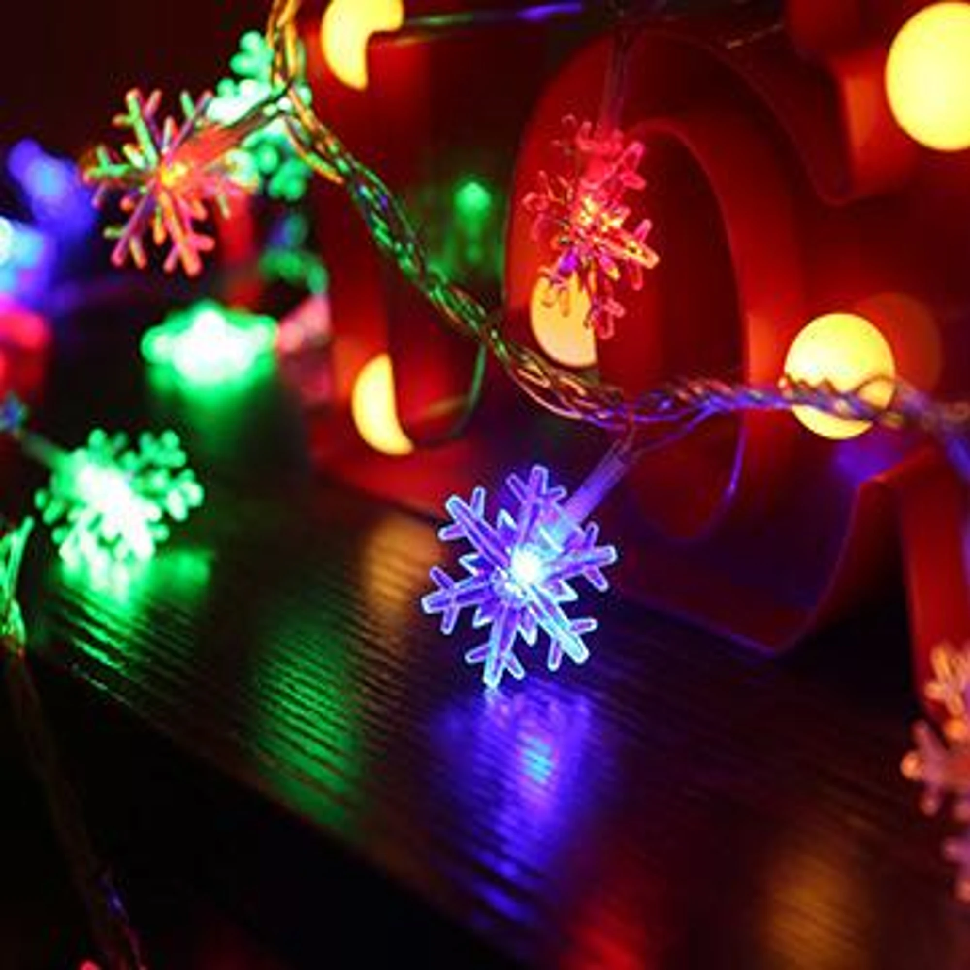 The image features a set of bright, multicolored snowflake-shaped Christmas lights. The lights come in an array of colors, including red, blue, yellow, and green, creating a festive and cheerful ambiance. These lights are perfect for adding a touch of holiday magic to any space, whether they are strung along walls, around windows, or used to decorate other festive displays. The dark background makes the vibrant colors of the lights stand out, highlighting their beautiful and intricate snowflake designs. This image captures the essence of holiday decoration and the joy associated with Christmas festivities.