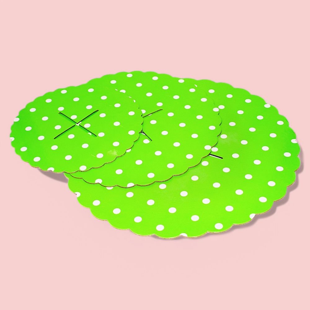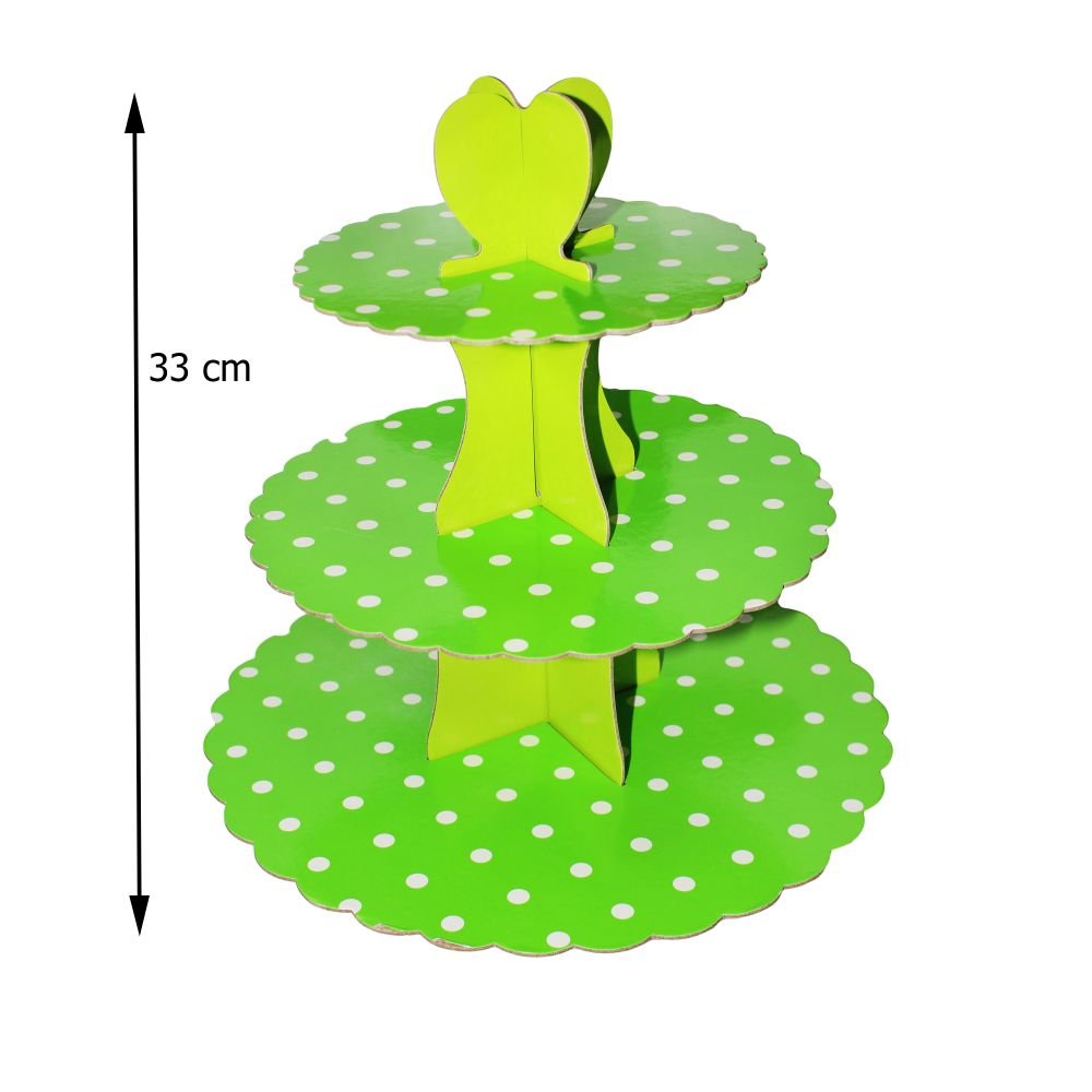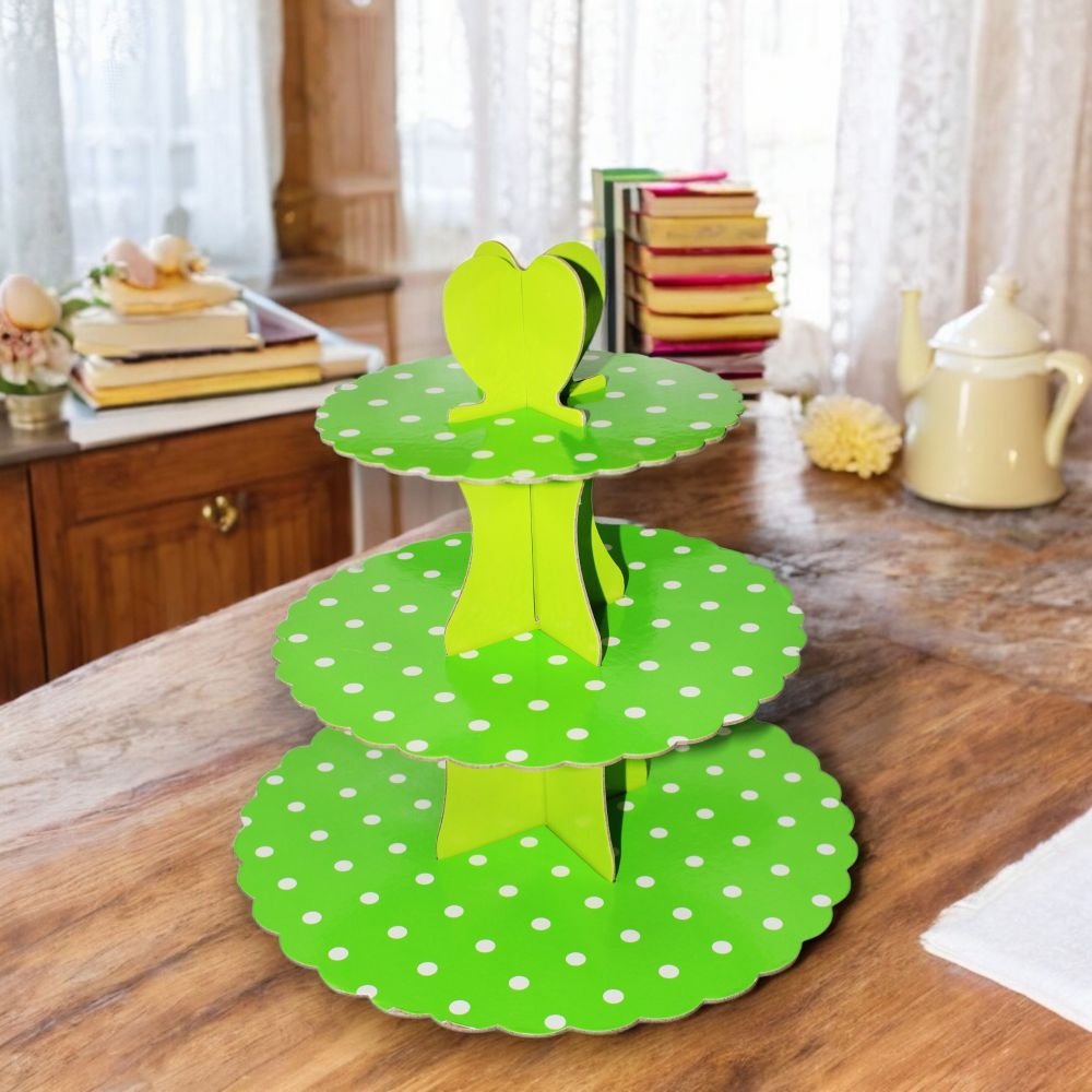 Transform your dessert table into a show-stopping centerpiece with this playful polka dot 3-tier cupcake stand. Designed in a lively green hue with charming white polka dots, it radiates joy and energy, making it perfect for birthdays, weddings, or any celebration. Each of the three scalloped-edge tiers provides ample space to elegantly display cupcakes, pastries, or other treats. Sturdy and easy to assemble, this stand combines practicality with aesthetic appeal. Whether you’re hosting an intimate gathering or a grand event, this stand will elevate your party decor, leaving guests wowed by its delightful design and functionality. Add this enchanting piece to your collection and make every occasion extra memorable!