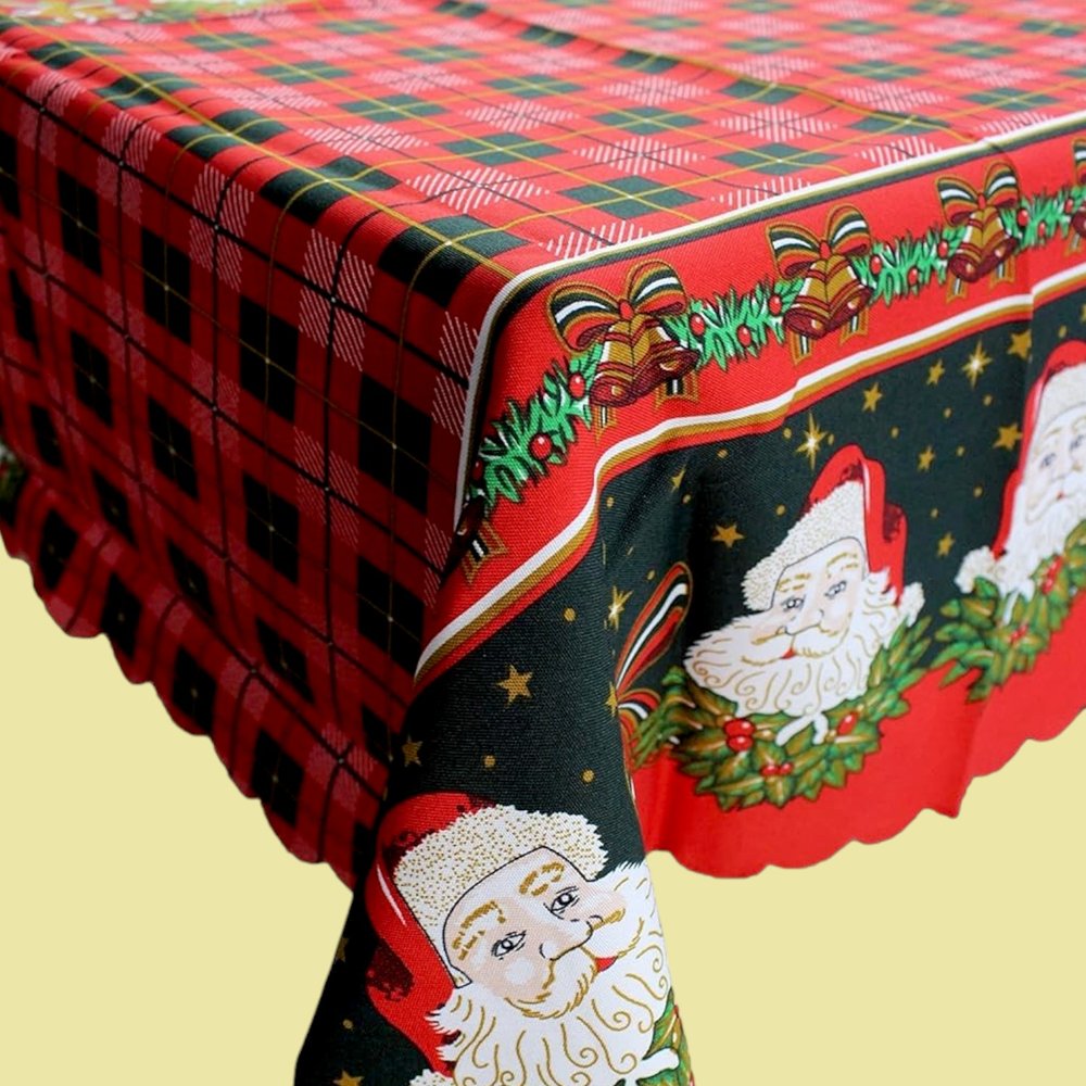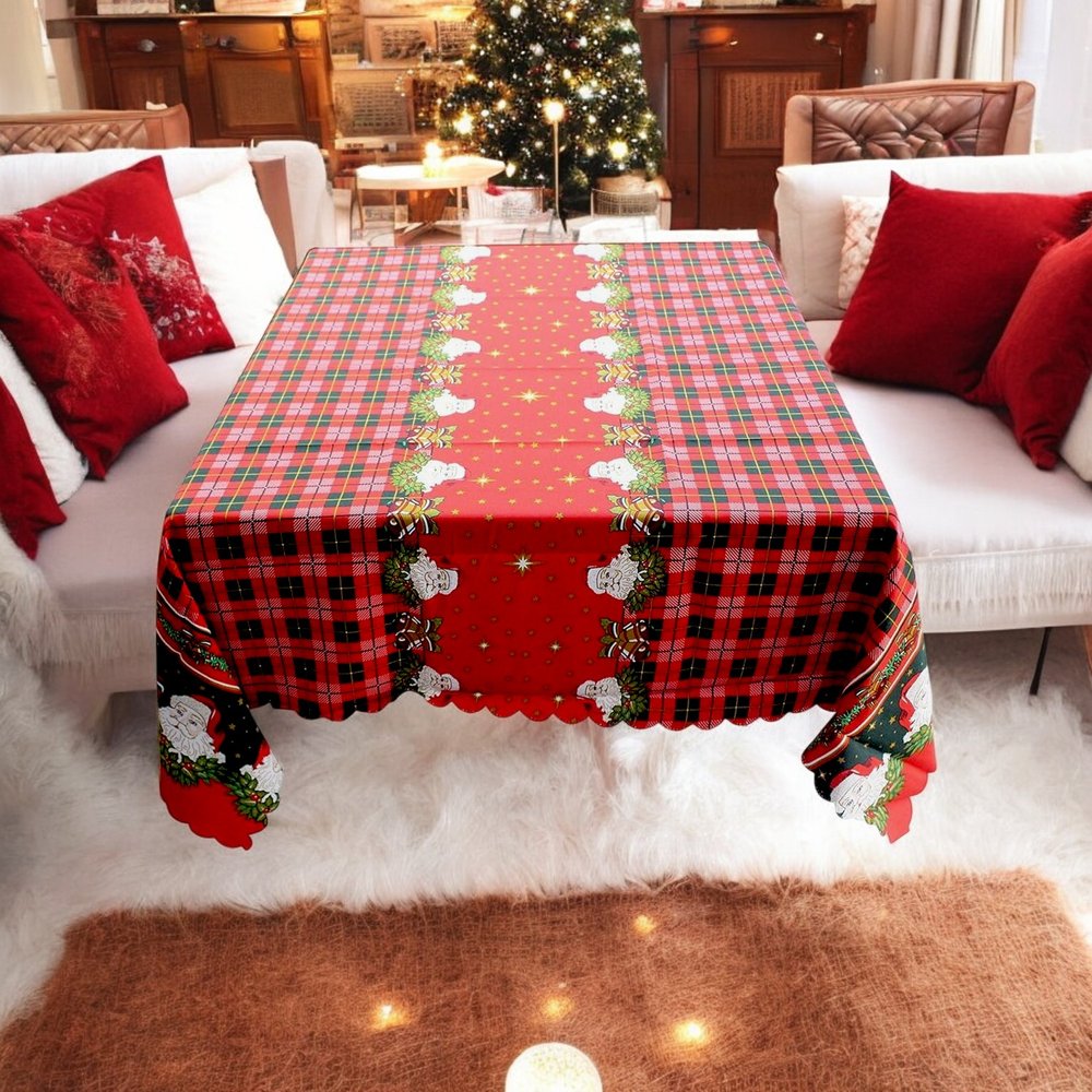 This vibrant tablecloth features a classic red and green plaid pattern, perfect for adding a festive touch to your holiday gatherings. The center of the tablecloth is adorned with a red strip decorated with cheerful Santa Claus faces, holly, and golden stars, creating a joyful and merry atmosphere. The scalloped edges add a charming detail, making this tablecloth an ideal choice for Christmas dinners and celebrations.